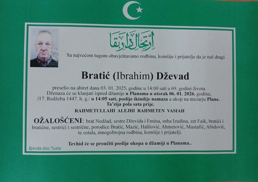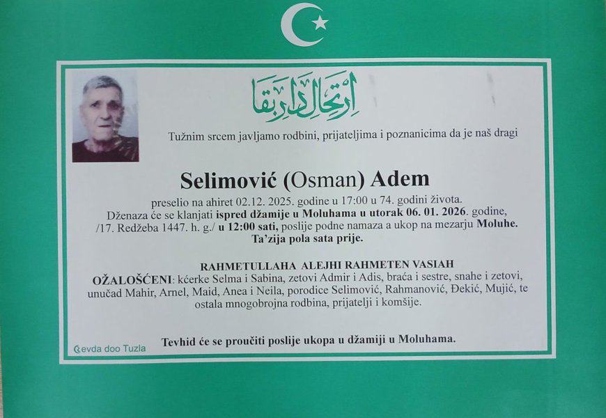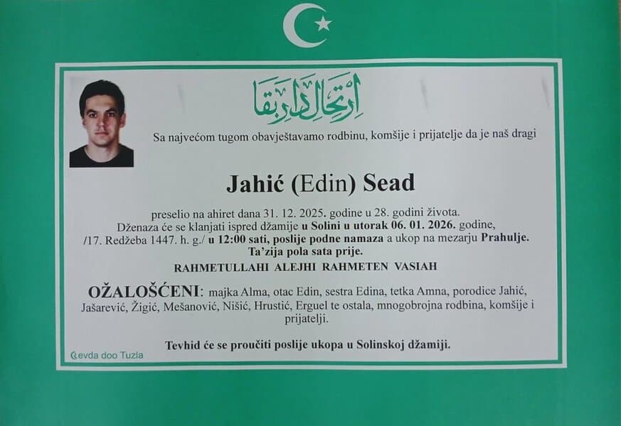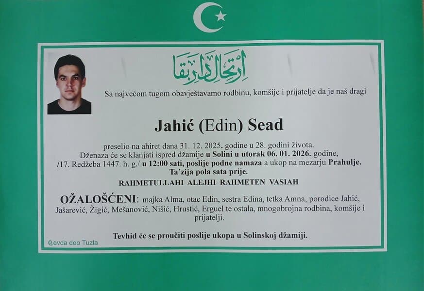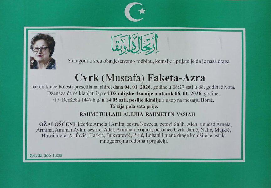In memoriam: Faketa-Azra CVRK, Adem SELIMOVIĆ, Dževad BRATIĆ, Sead JAHIĆPorodicama i rodbini upućujemo iskreno saučešće. Mir dušama njihovim. Laka im bh. zemlja Desk06. 01. 2026.In memoriam, Info Porodicama i rodbini upućujemo iskreno saučešće. Mir dušama njihovim – TuzlaLIVE.ba; Foto: PP Revda Tuzla) Post Views: 184 Podijeli