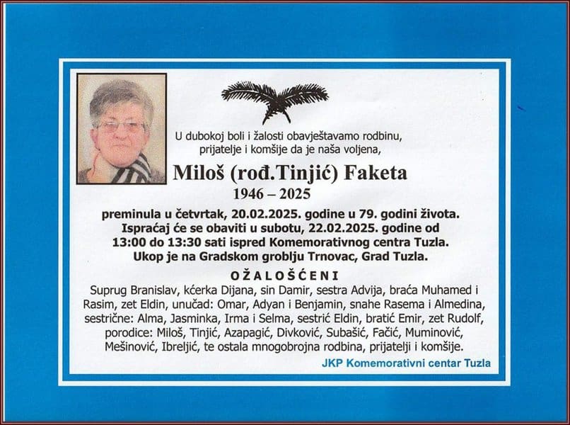 In memoriam: Faketa MILOŠ (Tinjić)Ispraćaj će se obaviti u subotu, 22. februara 2025. godine, ispred Komemorativnog centra u Tuzli... Desk21. 02. 2025.In memoriam, Info (Porodici, rodbini i prijateljima upućujemo iskreno saučešće – TuzlaL!VE.ba, Foto: Komemorativni centar Tuzla) Post Views: 440 Podijeli