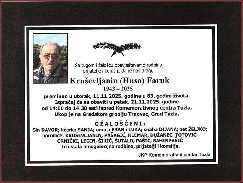 Ispraćaj poštovanog prijatelja i kolege, Faruka Kruševljanina, obavit će se u petak, 21. novembra 2025. godine, ispred Komemorativnog centra u Tuzli, u vremenu od 14 do 14:30 sati. Ukop je na Gradskom groblju Trnovac u Tuzli