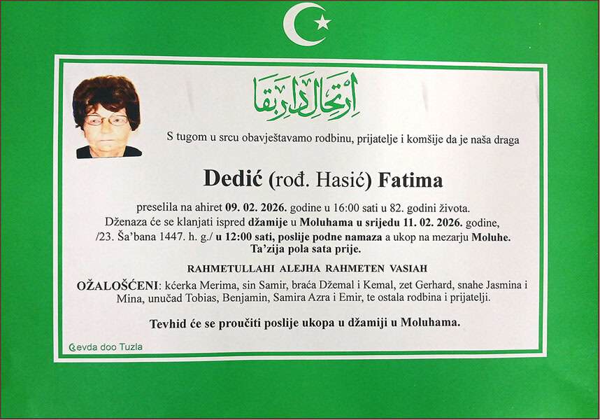 Dženaza će se klanjati ispred džamije u Moluhama, u srijedu, 11. februara 2026. godine, u 12:00 sati. Ukop je na mezarju Moluhe. Laka joj bh. zemlja