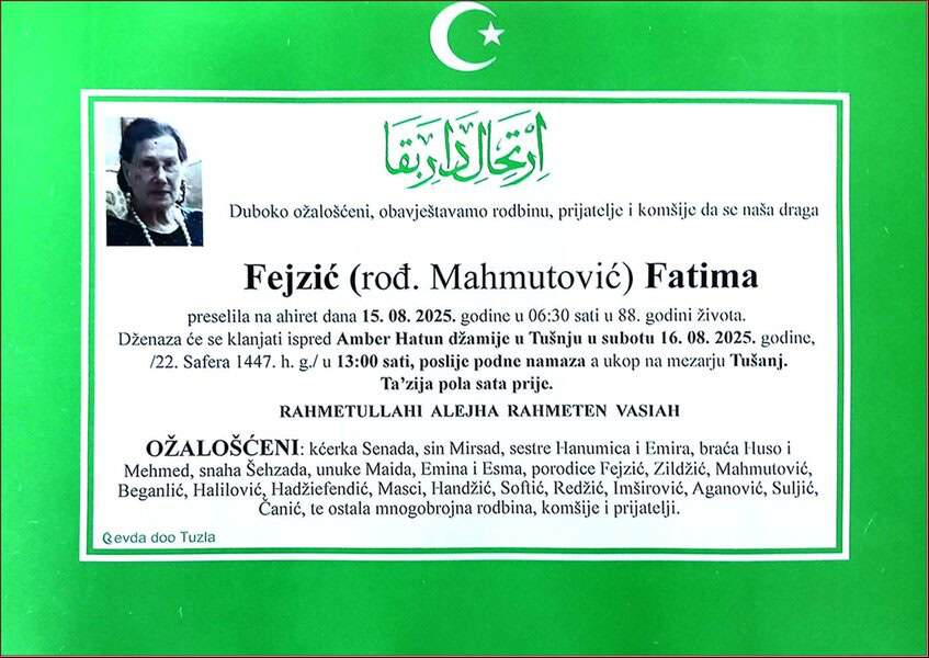 Dženaza će se klanjati ispred Amber Hatun džamije u Tušnju, u subotu, 16. augusta 2025. godine, u 13:00 sati