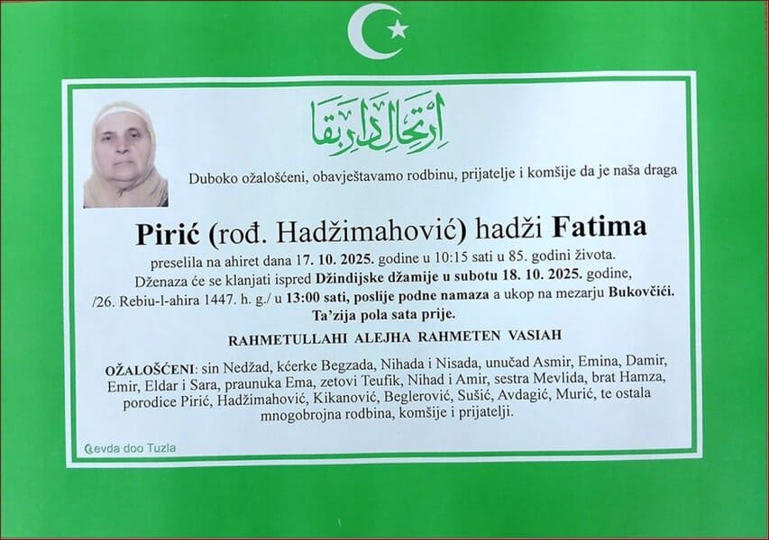 Dženaza će se klanjati ispred Džindijske džamije u Tuzli, u subotu, 18. oktobra 2025. godine, u 13:00 sati. Ukop je na mezarju Bukovčići