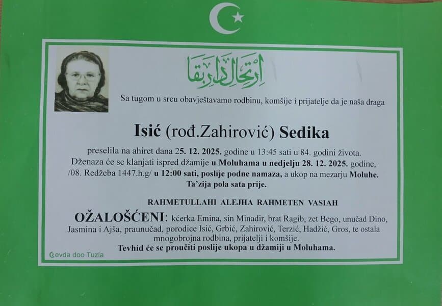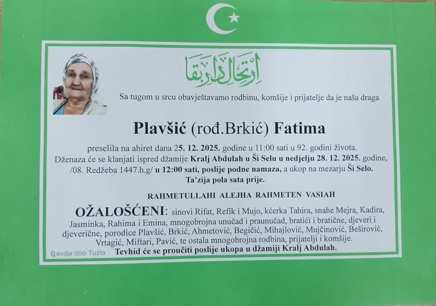 In memoriam: Fatima PLAVŠIĆ (Brkić); Sedika ISIĆ (Zahirović)Vječni rahmet njihovim dušama. Porodicama saučešće i sabur. Laka im bh. zemlja Desk28. 12. 2025.In memoriam, Info (Porodicama i rodbini upućujemo saučešće – Tuzlalive.ba; Foto: PP Revda Tuzla) Post Views: 254 Podijeli