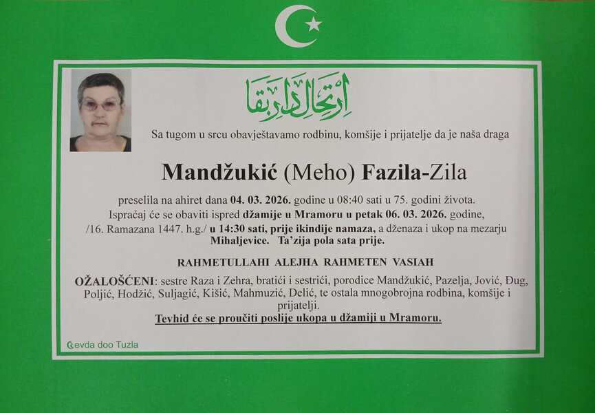 In memoriam: Fazila (Mehe) MANDŽUKIĆ – ZilaIspraćaj će se obaviti ispred džamije u Mramoru, u petak, 6. marta 2026. godine, u 14:30 sati. Dženaza i ukop na mezarju Mihaljevice Desk05. 03. 2026.In memoriam, Info (Porodici i rodbini iskreno saučešće. Mir duši njenoj – Tuzlalive.ba; Foto: PP Revda Tuzla) Post Views: 121 Podijeli