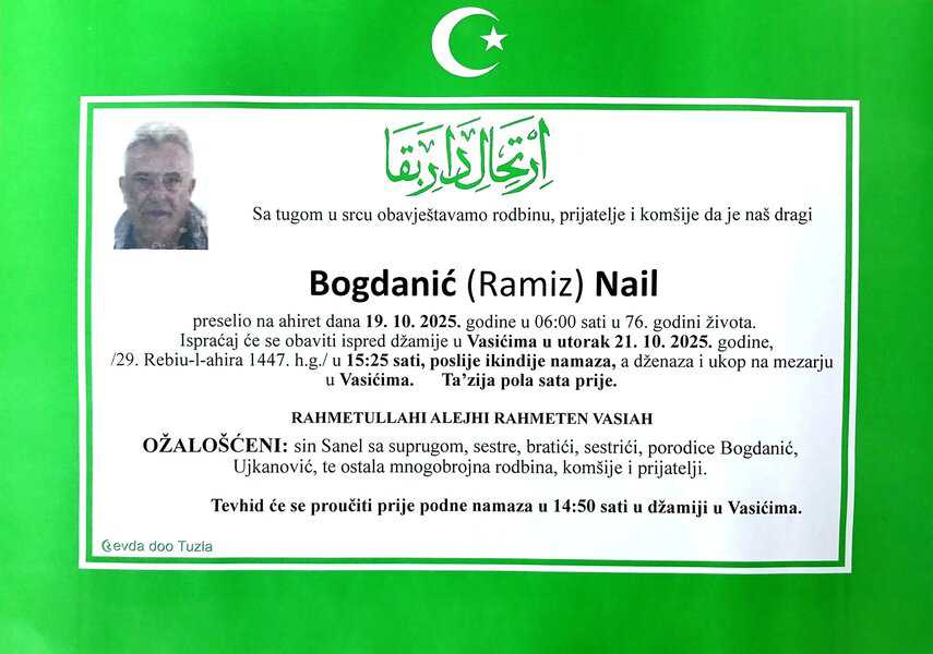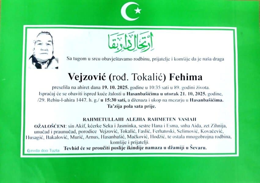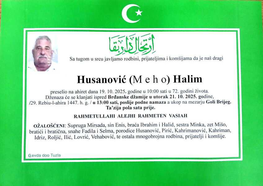 In memoriam: Fehima VEJZOVIĆ, Halim HUSANOVIĆ, Nail BOGDANIĆ, Enver KIKANOVIĆ (Foto)Preminulo je više naših sumještana, prijatelja i komšija. Neka je vječni rahmet njihovim dušama. Laka im bh. zemlja... Desk20. 10. 2025.In memoriam, Info (Porodicama i rodbini upućujemo saučešće i sabur – portal Tuzlalive.ba; Foto: PP Revda Tuzla) Post Views: 248 Podijeli
