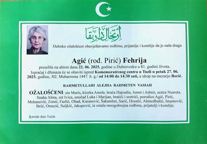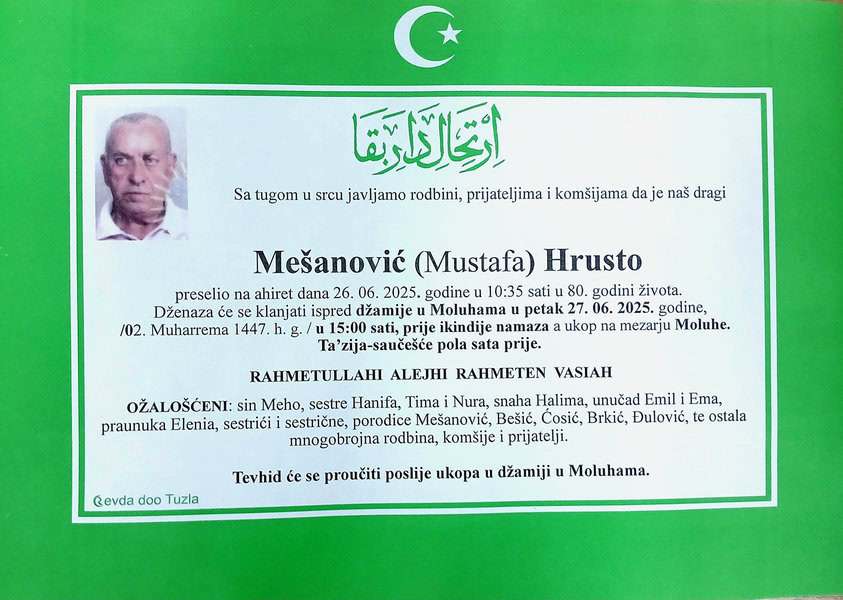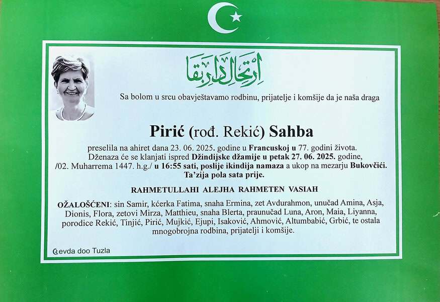 In memoriam: Fehrija AGIĆ (Pirić), Sahba PIRIĆ (Rekić), Hrusto (Mustafe) MEŠANOVIĆPreminulo je više naših sumještana, komšija i prijatelja. Mir dušama njihovim. Laka im bh. zemlja. Porodicama saučešće i sabur... Desk26. 06. 2025.In memoriam, Info (Porodicama i rodbini upućujemo iskreno saučešće – portal Tuzlalive.ba; Foto: PP Revda Tuzla) Post Views: 349 Podijeli