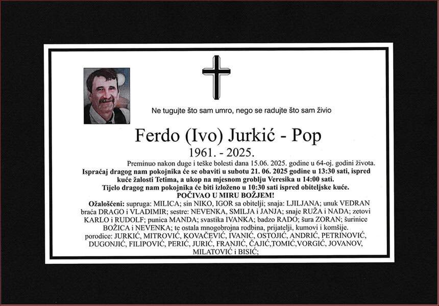 In memoriam: Ferdo (Ive) JURKIĆ – Pop"Ne tugujte što sam umro, nego se radujte što sam živio" Desk19. 06. 2025.In memoriam, Info (Porodici, rodbini i prijateljima upućujemo iskreno saučešće – TuzlaL!VE.ba; Foto: PD Zoka doo Tuzla) Post Views: 406 Podijeli