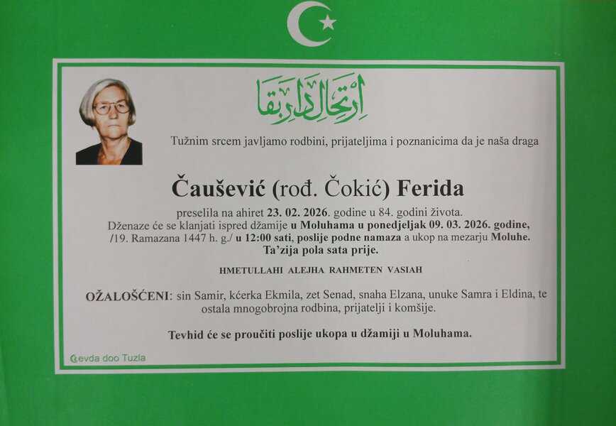 In memoriam: Ferida ČAUŠEVIĆ (Čokić)Dženaza će se klanjati ispred džamije u Moluhama, u ponedjeljak, 9. marta 2025. godine u 12:00 sati. Laka joj bh. zemlja Desk09. 03. 2026.In memoriam, Info (Porodici i rodbini upućujemo saučešće i sabur. Mir duši njenoj – Tuzlalive.ba; Foto: PP Revda Tuzla) Post Views: 279 Podijeli