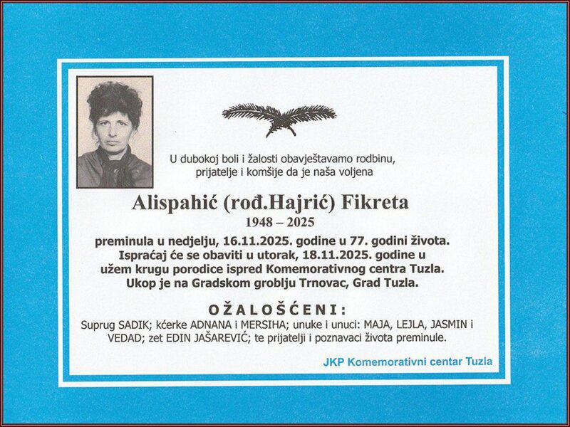 Ispraćaj će se obaviti u utorak, 18. novembra 2025. godine, u užem krugu porodice, ispred Komemorativnog centra Tuzla. Ukop je na Gradskom groblju Trnovac, Grad Tuzla