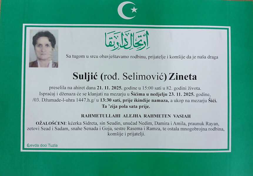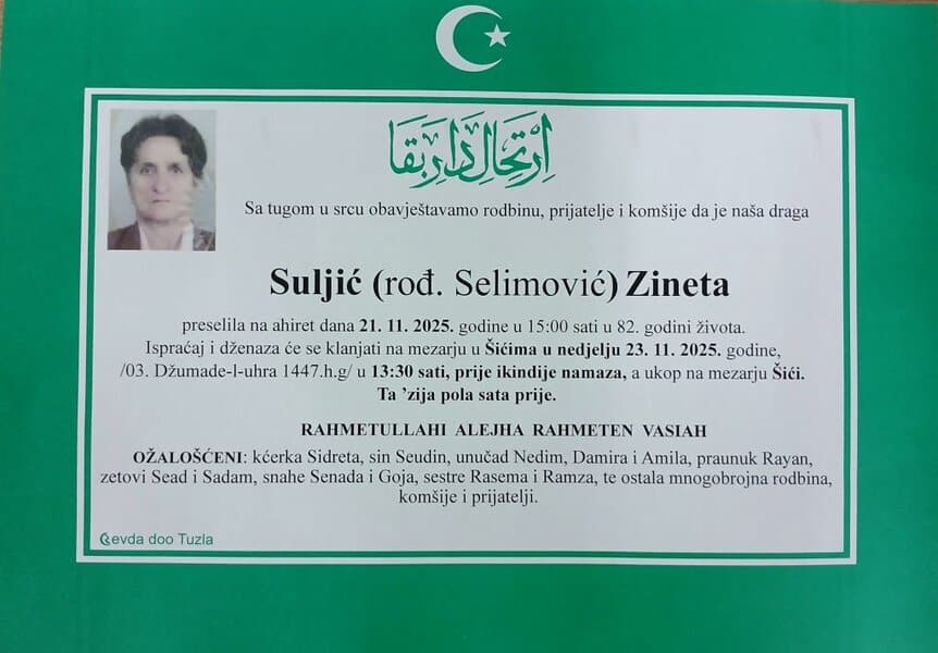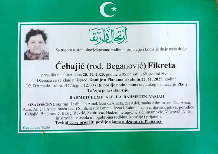 Preselile su na ahiret naše sumještanke i komšinice, Fikreta Ćehajić i Zineta Suljić. Neka je vječni rahmet njihovim dušama. Porodicama saučešće i sabur. Laka im bh. zemlja
