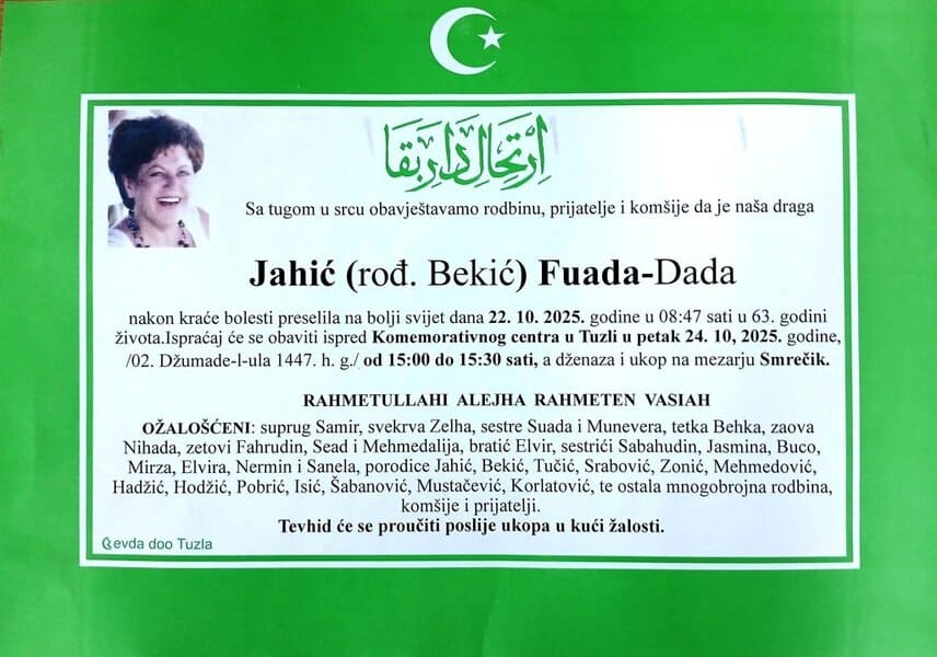 In memoriam: Fuada – Dada JAHIĆ (Bekić)Prerano nas je, u 63. godini, napustila sugrađanka, prijateljica i komšinica, Fuada - Dada JAHIĆ (Bekić). Upućujemo joj posljednji pozdrav. Mir duši njenoj. Laka joj bh. zemlja Desk23. 10. 2025.In memoriam, Info (Porodici i rodbini upućujemo saučešće i sabur – Foto: PP Revda Tuzla) Post Views: 426 Podijeli