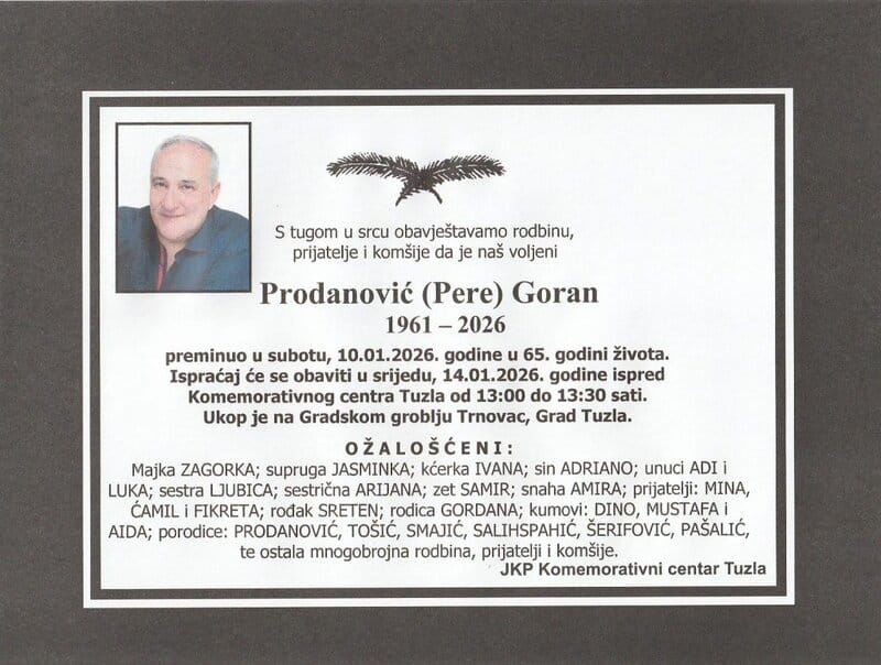 Prerano nas je, u 65. godini, napustio sugrađanin, prijatelj i komšija, Goran (Pere) PRODANOVIĆ. Upućujemo mu posljednji pozdrav. Neka mu je vjačna slava i hvala. Laka mu bh. zemlja