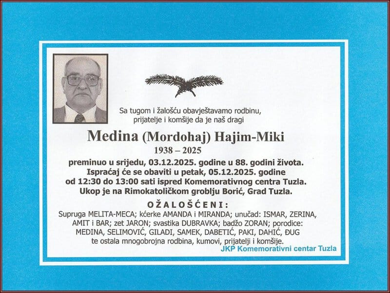 Ispraćaj će se obaviti u petak, 5. decembra 2025. godine, od 12:30 do 13:00 sati, ispred Komemorativnog centra Tuzla, dok je ukop na Rimokatoličkom groblju Borić u Tuzli