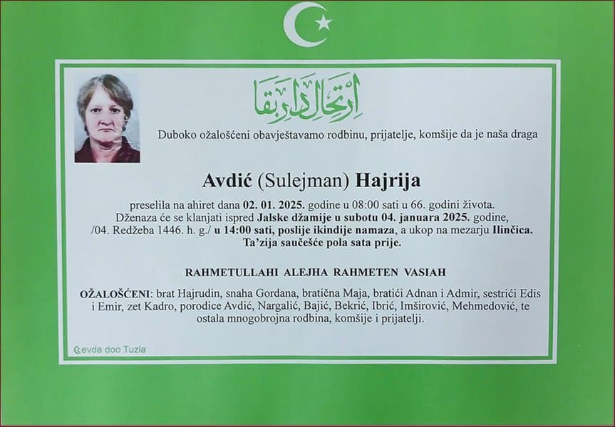 Preminula je u 66. godini naša sugrađanka i komšinica, Hajrija (Sulejmana) Avdić. Mir duši njenoj. Laka joj bh. zemlja...