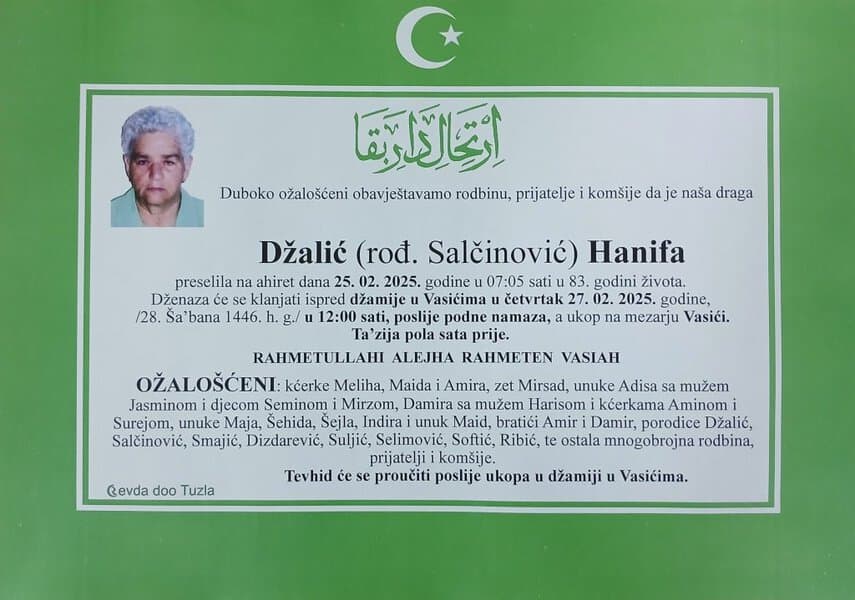 Dženaza će se klanjati ispred džamije u Vasićima, u četvrtak, 27. februara 2025. godine u 12 sati...