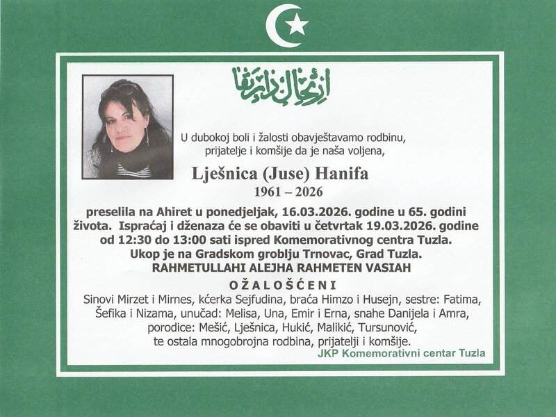 Preselila na ahiret u 65. godini. Neka je vječni rahmet njenoj duši. Ispraćaj i dženaza će se obaviti u četvrtak, 19. marta 2026. godine, od 12:30 do 13:00 sati, ispred Komemorativnog centra u Tuzli. Laka joj bh. zemlja