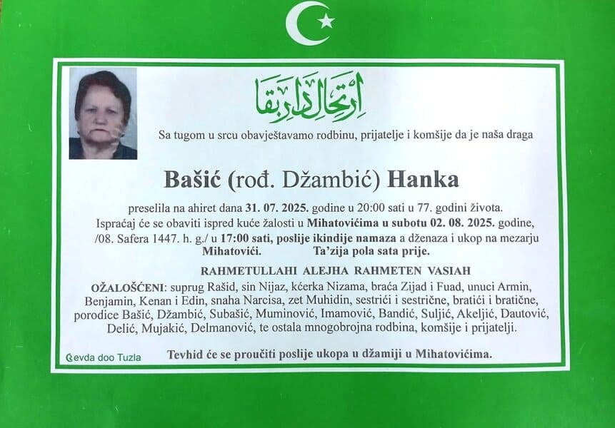 In memoriam: Hanka BAŠIĆ, Bajro SMAJLOVIĆ, Hana DURAKOVIĆ, Mujo PAŠALIĆ (Foto)Preminulo je više naših sumještanki i sumještana. Upućujemo im posljednji pozdrav. Neka je vječni rahmet njihovim dušama. Laka im bh. zemlja Desk01. 08. 2025.In memoriam, Info (Porodicama i rodbini upućujemo saučešće – portal Tuzlalive,ba; Foto: PP Revda Tuzla) Post Views: 319 Podijeli