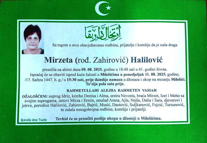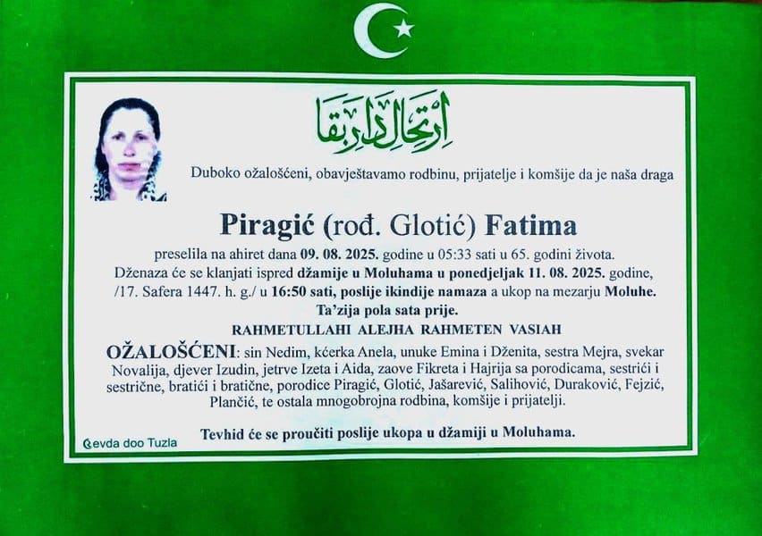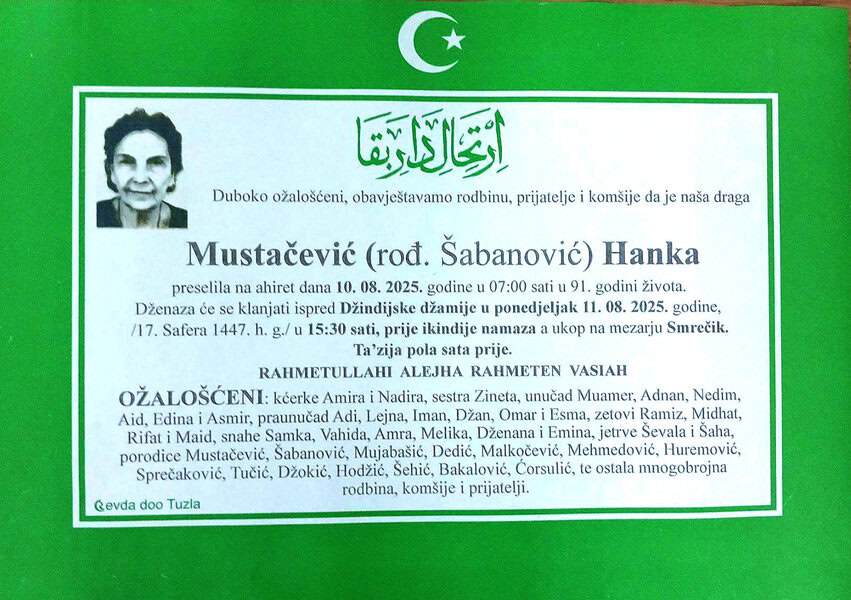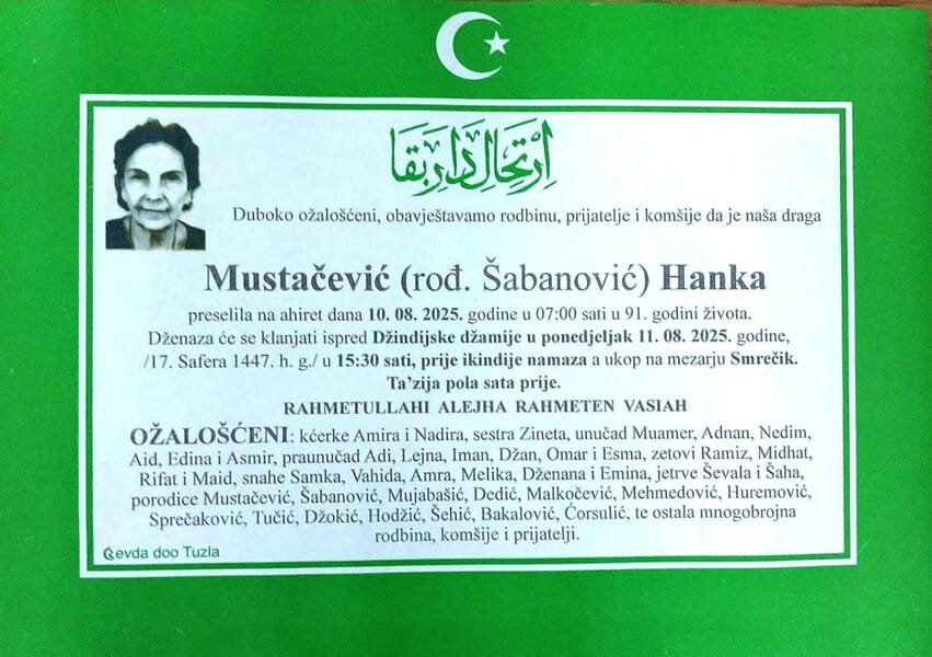In memoriam: Hanka MUSTAČEVIĆ, Mirzeta HALILOVIĆ, Fatima PIRAGIĆ (Foto)Preminulo je više naših sumještanki, prijateljica i komšinica. Nerka je vječni rahmet njihovim dušama. Laka im bh. zemlja... Desk10. 08. 2025.In memoriam, Info (Porodicama i rodbini izražavamo iskreno saučešće. Mir dušama njihovim – portal Tuzlalive.ba; Foto: PP Revda Tuzla) Post Views: 288 Podijeli