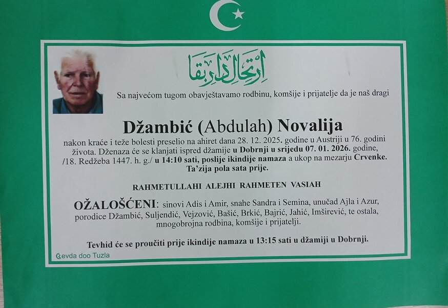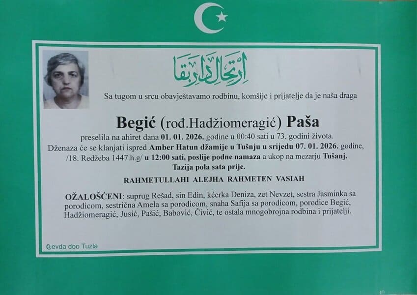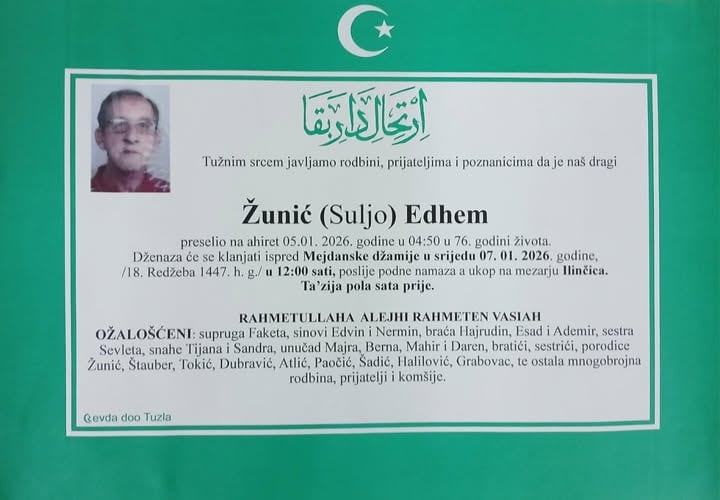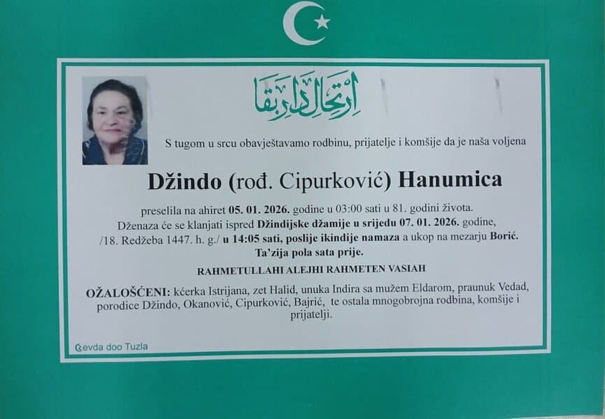 In memoriam: Hanumica DŽINDO, Novalija Džambić, Paša BEGIĆ, Edhem ŽUNIĆ, Rasim HUSEJNOVIĆPreminulo je više naših sumještana, komšija i prijatelja. Neka im je vječni rahmet. Laka im bh. zemlja Desk06. 01. 2026.In memoriam, Info (Porodicama i rodbini upućujemo saučešće i sabur – TuzlaLIVE.ba; Foto: PP Revda Tuzla) Post Views: 228 Podijeli