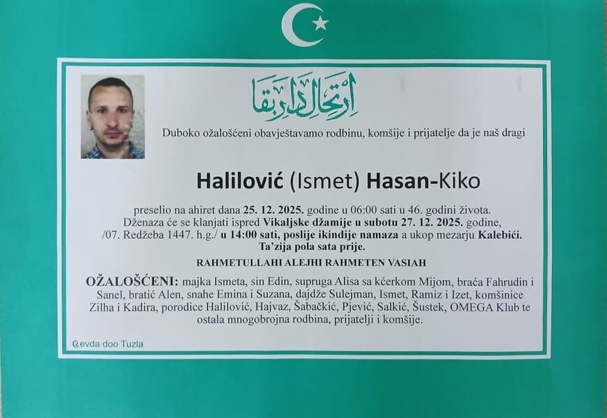 In memoriam: Hasan (Ismeta) HALILOVIĆ – KikoPrerano nas je, u 46. godini, napustio Hasan - Kiko HALILOVIĆ. Mir duši njegovoj. Laka mu bh. zemlja Desk26. 12. 2025.In memoriam, Info (Porodici i rodbini izražavamo saučešće – portal Tuzlalive.ba; Foto: PP Revda Tuzla) Post Views: 1.040 Podijeli