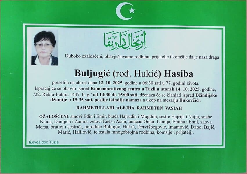 Preminula je naša sugrađanka, prijateljica i komšinica, Hasiba BULJUGIĆ (Hukić). Upućujemo joj posljednji pozdrav. Neka je vječni rahmet njenoj duši. Laka joj bh. zemlja...