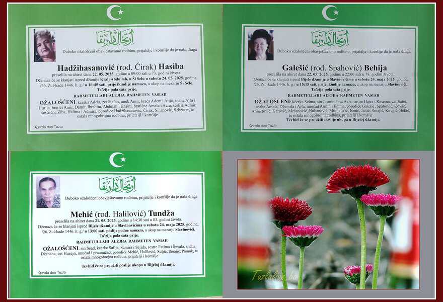 In memoriam: Hasiba HADŽIHASANOVIĆ (Čirak), Behija GALEŠIĆ (Spahović), Tundža MEHIĆ (Halilović)Neka im je laka bh. zemlja. Mir dušama njihovim. Porodicama saučešće i sabur Desk23. 05. 2025.In memoriam, Info (Porodiciama rodbini i prijateljima upućujemo iskreno saučešće – TuzlaL!VE.ba, Foto: PP Revda Tuzla) Post Views: 325 Podijeli