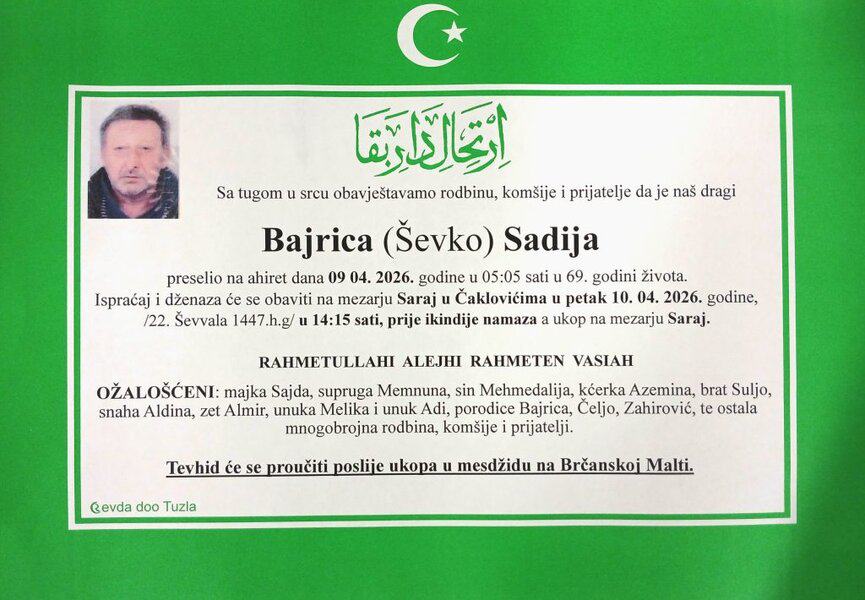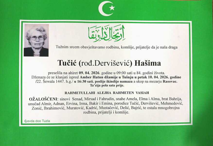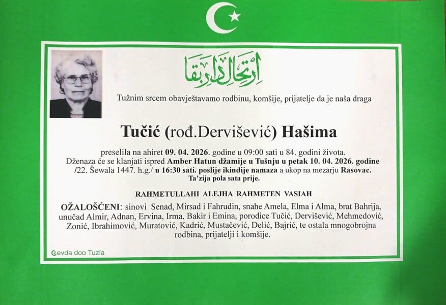 In memoriam: Hašima TUČIĆ (Dervišević), Sadija (Ševke) BAJRICAObje dženaze obavit će se u petak, 10. aprila 2026. godine. Neka im je vječni rahmet dušama i laka bh. zemlja Desk09. 04. 2026.Društvo (Porodicama i rodbini upućujemo iskreno saučešće. Mir dušama njihovim – Tuzlalive.ba; Foto: PP Revda Tuzla) Post Views: 129 Podijeli