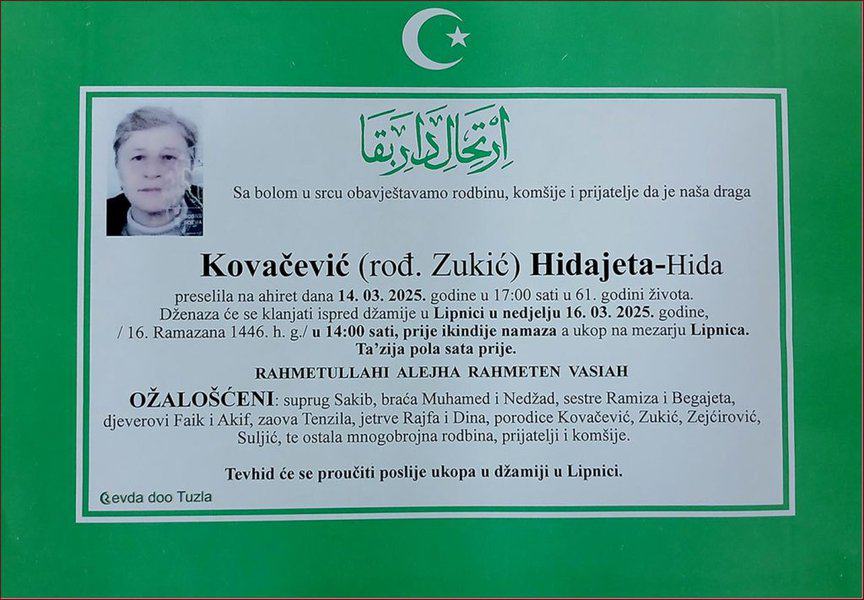 Prerano nas je, u 61. godini, napustila sumjeptanka i komšinica, Hidajeta - Hida Kovačević (Zukić). Mir duši njenoj, laka joj bh. zemlja...