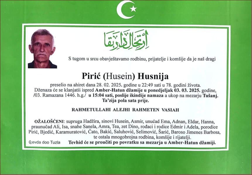 In memoriam: Husnija (Huseina) PIRIĆDženaza će se klanjati ispred Amber-Hatun džamije u Tušnju, u ponedjeljak, 3. marta 2025. godine Desk03. 03. 2025.In memoriam, Info (Porodici, rodbini i prijateljima upućujemo iskreno saučešće – TuzlaL!VE.ba, Foto: PP Revda Tuzla) Post Views: 383 Podijeli