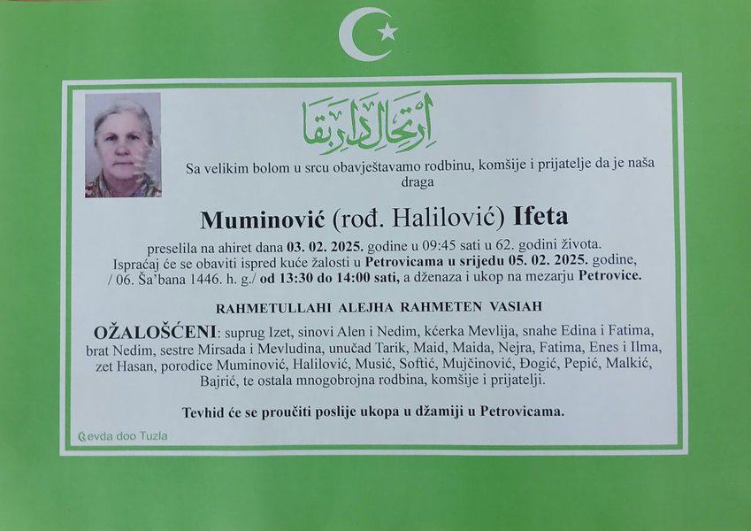 Prerano je, u 62. godini, preminula Ifeta Muminović (Halilović). Neka je mir duši njenoj. Laka joj bh. zemlja...