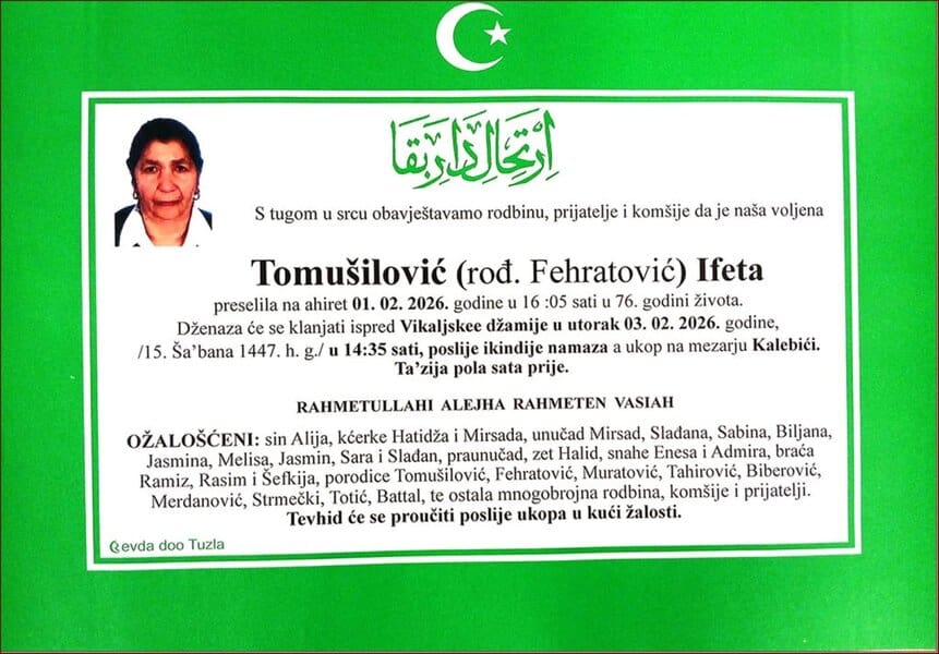 Dženaza će se klanjati ispred Vikaljske džamije u Tuzli, u utorak, 3. februara 2026. godine, u 14:35 sati. Ukop je na mazarju Kalebići