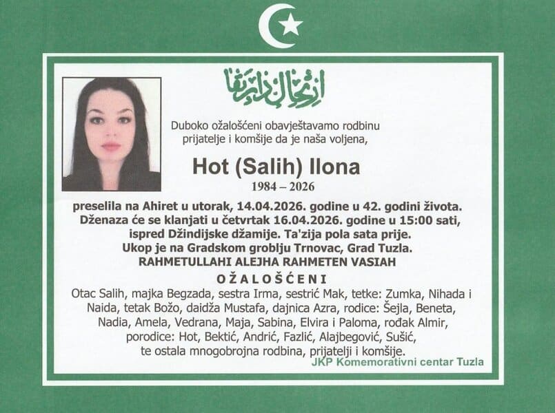 Prerano nas je, u 42. godini, napustila sugrađanka, prijateljica, komšinica, bivša sportašica, Ilona (Saliha) HOT. Upućujemo joj posljednji pozdrav. Mir duši njenoj- Laka joj bh. zemlja