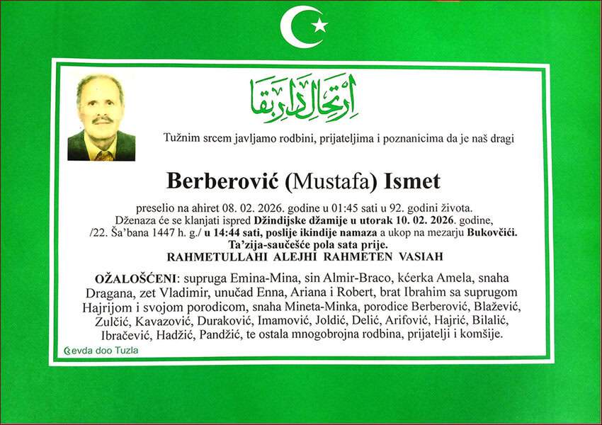 Dženaza će se klanjati ispred Džindijske džamije u Tuzli, u utorak, 10. februara 2026. godine, u 14:44 sati. Ukop je na mezarju Bukovčići. Laka mu bh. zemlja