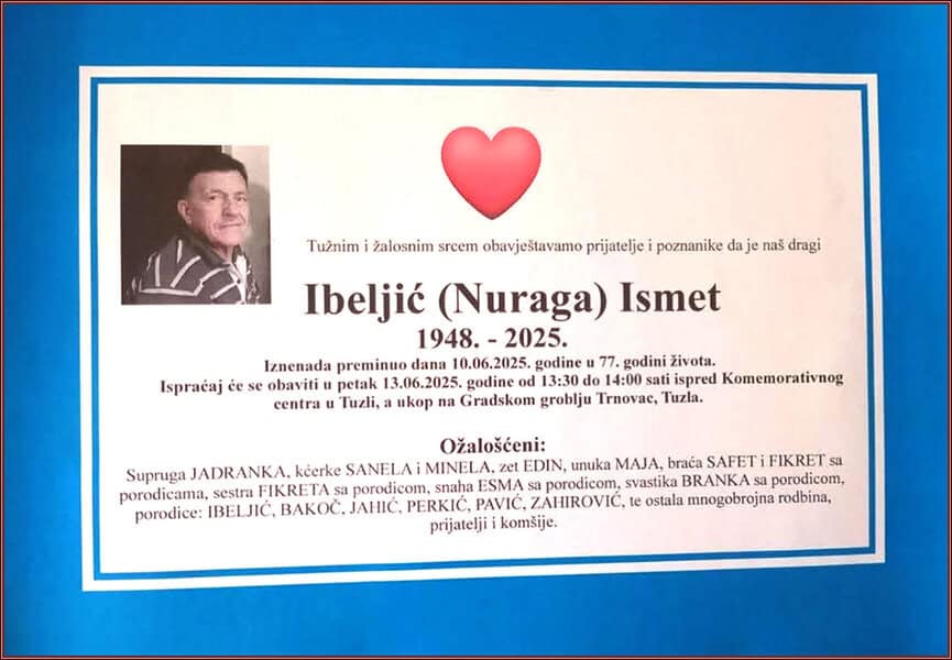 In memoriam: Ismet (Nurage) IBELJIĆIznenada preminuo u 77. godini. Upućujemo mu posljednji pozdrav. Mir duši njegovoj. Porodici saučešće Desk13. 06. 2025.In memoriam, Info (Porodici, rodbini i prijateljima upućujemo iskreno saučešće – TuzlaL!VE.ba, Foto: JKPC) Post Views: 435 Podijeli