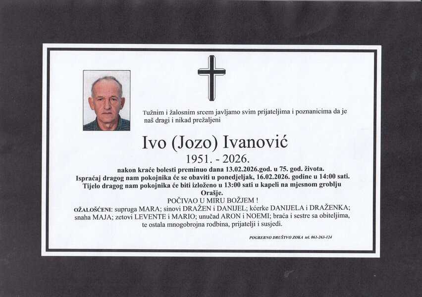 Ispraćaj će se obaviti u ponedjeljak, 16. februara 2026. godine u 14:00 sati, na mjesnom groblju u Orašju. Počivao u miru Božjem, laka mu bh. zemlja