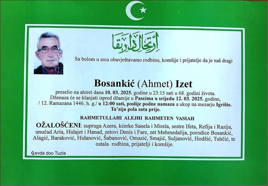 In memoriam: Izet (Ahmeta) BOSANKIĆPreselio na ahiret u 68. godini. Neka mu je vječni rahmet duši. Laka mu bh. zemlja... Desk11. 03. 2025.In memoriam, Info (Porodici, rodbini i prijateljima upućujemo iskreno saučešće – TuzlaL!VE.ba, Foto: PP Revda Tuzla) Post Views: 510 Podijeli