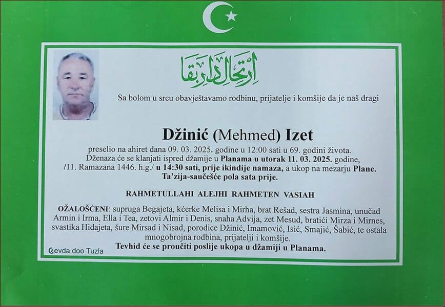 In memoriam: Izet (Mehmed) DžinićDženaza će se klanjati ispred džamije u Planama, u utorak, 11. marta 2025. godine u 14:30 sati... Desk10. 03. 2025.In memoriam, Info (Porodici, rodbini i prijateljima upućujemo iskreno saučešće – TuzlaL!VE.ba, Foto: PP Revda Tuzla) Post Views: 389 Podijeli