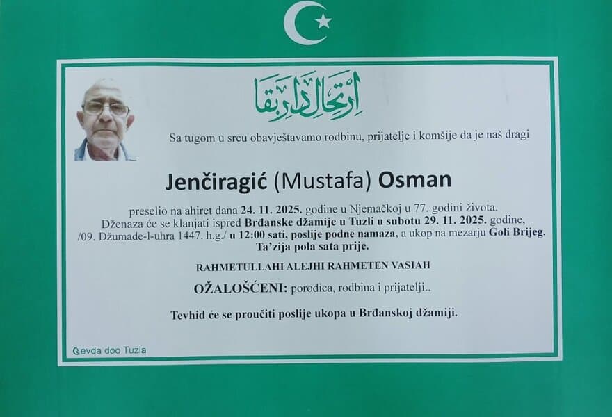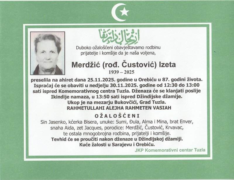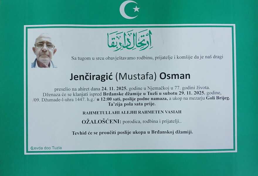 In memoriam: Izeta MERDŽIĆ (Ćustović), Avdulah (Nezira) OMEROVIĆ – Kudro, Osman (Mustafe) JENČIRAGIĆUpućujemo im posljednji pozdrav. Neka im je laka bh. zemlja, a vječni rahmet dušama Desk28. 11. 2025.In memoriam, Info (Porodicama i rodbini upućujemo iskreno saučešće – portal Tuzlalive.ba; Foto: Komemorativni centar i PP Revda Tuzla) Post Views: 139 Podijeli