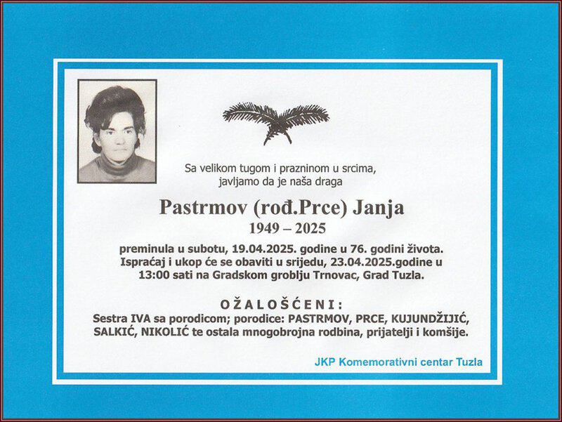 Preminula je naša sugrađanka, komšinica i prijateljica, Janja Pastrmov (Prce). Upućujemo joj posljednji pozdrav, a porodici saučešće. Slava joj i hvala. Laka joj bh. zemlja...