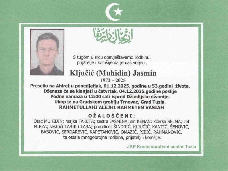 Prerano nas je u 53. godini, napustio Jasmin (Muhidina) KLJUČIĆ, dobar sugrađanin, komšija i prijatelj. Neka je mir njegovoj duši. Laka mu bh. zemlja