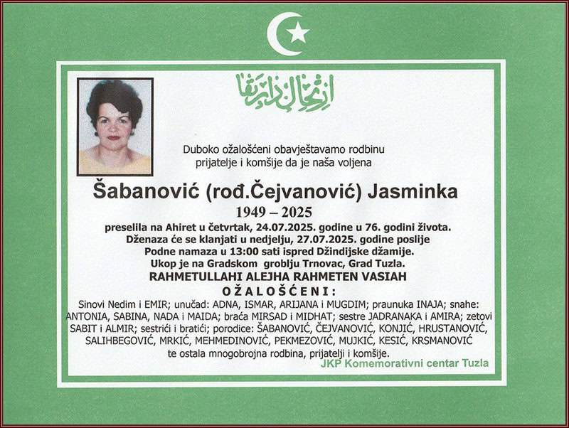 Dženaza će se klanjati u nedjelju, 27. jula 2027. godine u 13:00 sati ispred Džindijske džamije u Tuzli, dok je ukop na Gradskom groblju Trnovac, Grad Tuzla