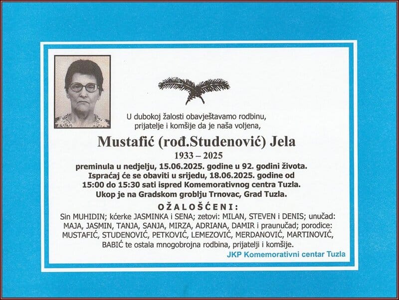 Ispraćaj će se obaviti u srijedu, 18. juna 2025. godine, ispred Komemorativnog centra u Tuzli, od 15:00 do 15:30 sati. Ukop je na Gradskom groblju Trnovac, Grad Tuzla