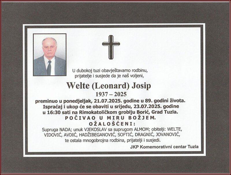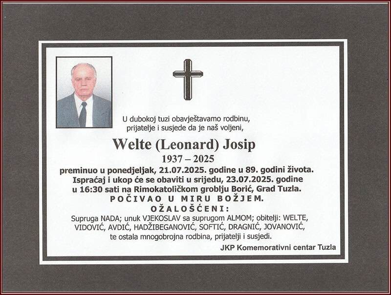 Ispraćaj i ukop obavit će se u srijedu, 23. jula 2025. godine, u 16:30 sati, na Rimokatoličkom groblju Borić u Tuzli. Počivao u miru Božjem. Laka mu bh. zemlja!