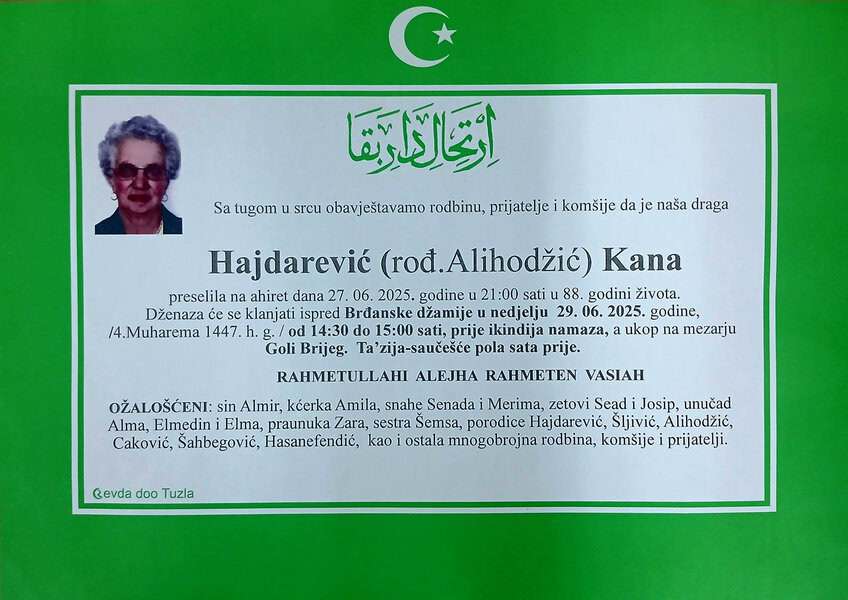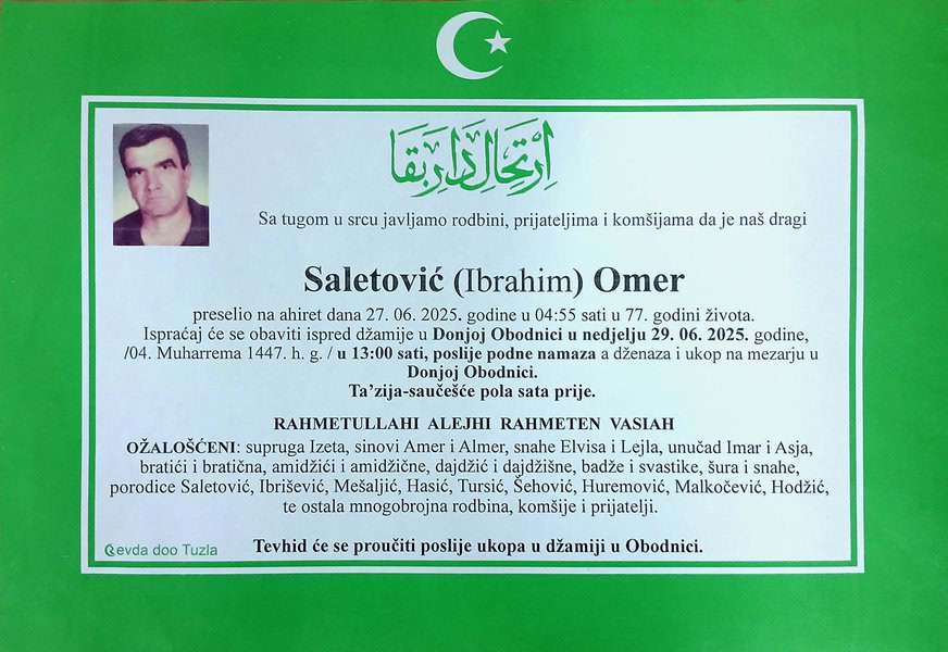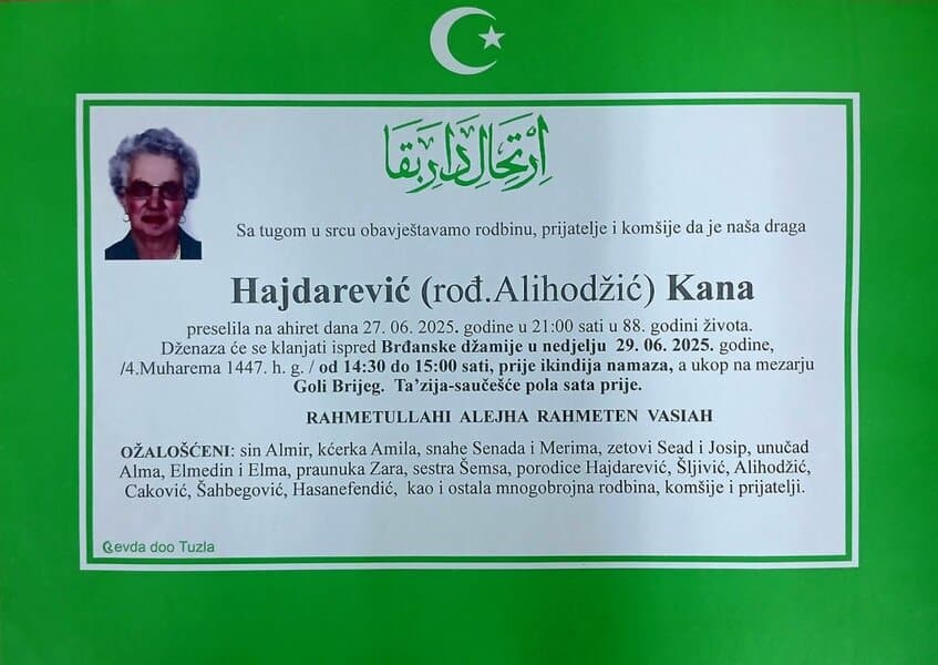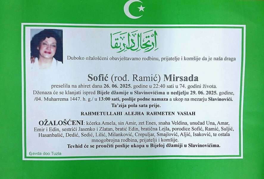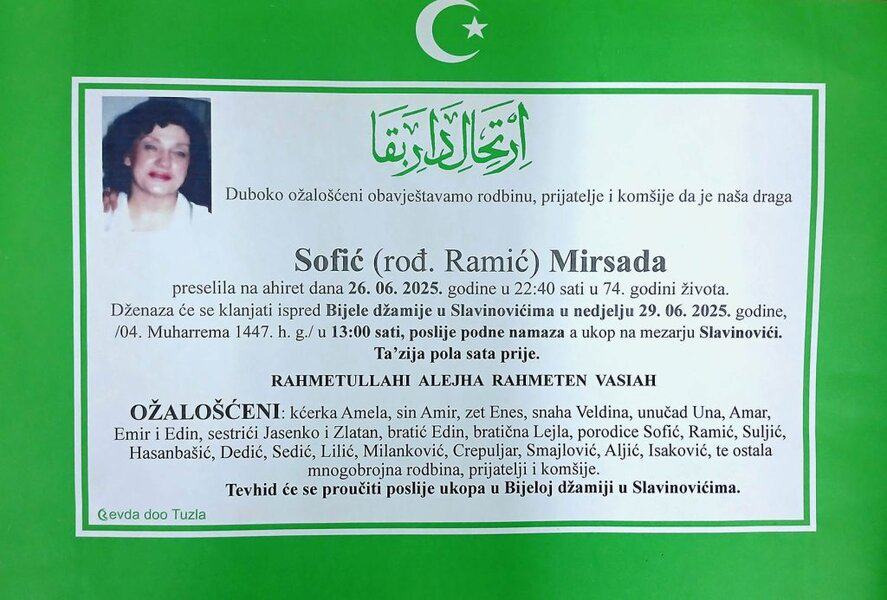 In memoriam: Kana HAJDAREVIĆ, Mirsada SOFIĆ, Omer SALETOVIĆ (Foto)Preminulo je više našigh sumještana, prijatelja i komšija. Kliknite na FOTO za punu informaciju Desk29. 06. 2025.In memoriam, Info, Vijesti (Porodicama, rodbini i prijateljima upućujemo saučešće. Mir dušama njihovim – Tuzlalive.ba; Foto: PP Revda Tuzla) Post Views: 313 Podijeli
