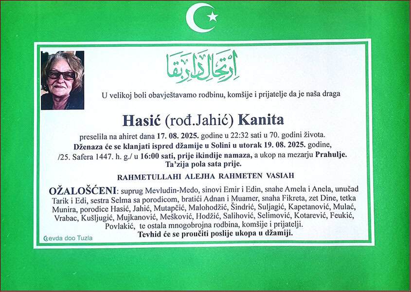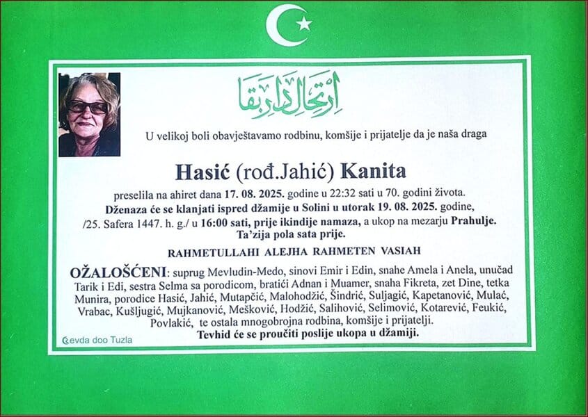 Preselila je na ahiret naša sumještanka i komšinica, Kanita HASIĆ (Jahić). Upućujemo joj posljednji pozdrav, Neka je rahmet njenoj duši, a laka bh. zemlja. Porodici i rodbini saučešće i sabur