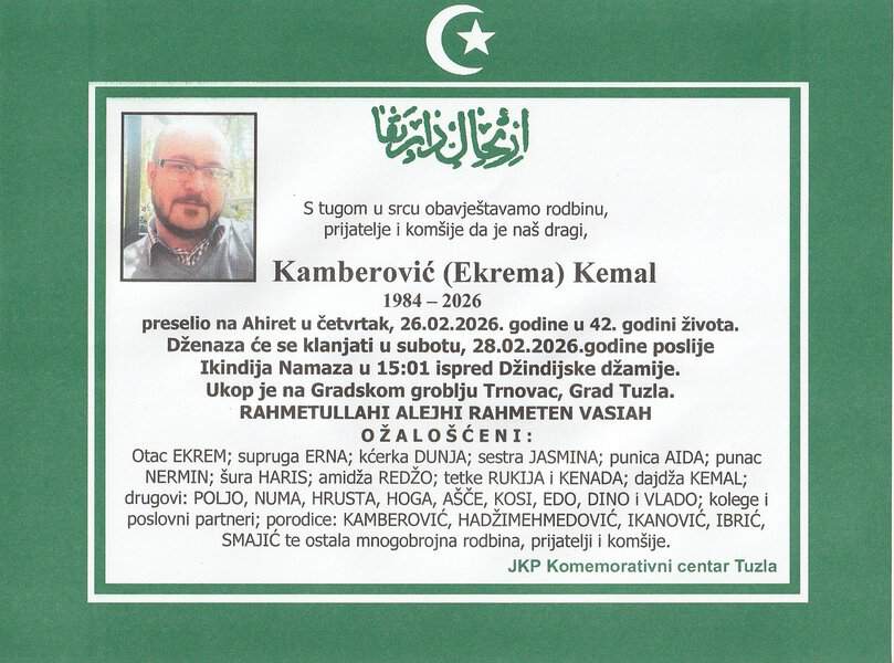 Vrlo mlad je, u 42. godini, preminuo naš sugrađanin, komšija i prijatelj, Kemal (Ekrema) Kamberović. Počivao u miru. Laka mu bh. zemlja.