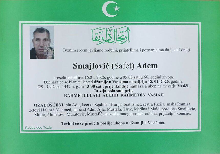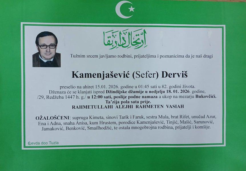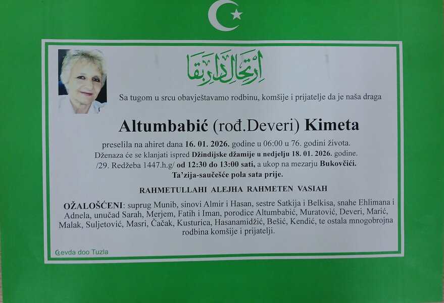 In memoriam: Kimeta ALTUMBABIĆ (Deveri), Derviš (Sefera) KAMENJAŠEVIĆ, Adema (Safeta) SMAJLOVIĆNeka je vječni rahmet njihovim dušama. Porodicama i rodbini saučešće i sabur. Laka im bh. zemlja Desk18. 01. 2026.In memoriam, Info (Porodicama i rodbini upućujemo iskreno saučešće. Mir dušama njihovim – portal TuzlaLIVE.ba; Foto: PP Revda Tuzla) Post Views: 304 Podijeli