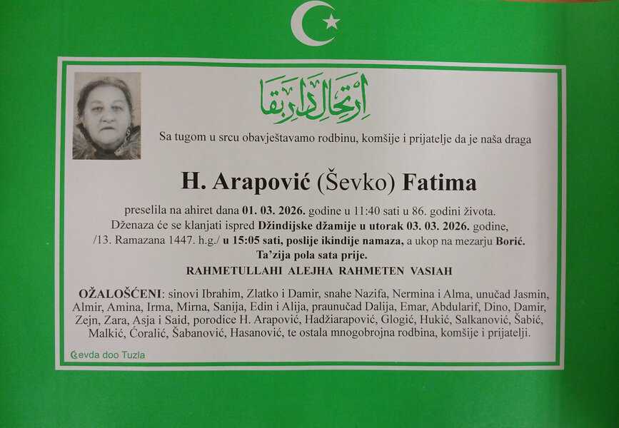 In memoriam: Lejla HOROZIĆ (Sinanović); Fatima (Ševke) H.ArapovićNeka je vječni rahmet njihovim dušama. Laka im bh. zemlja. Porodicama saučešće i sabur. Desk02. 03. 2026.In memoriam, Info (Porodicama i rodbini izražavamo saučešće i sabur. Mir dušama njihovim – Tuzlalive.ba; Foto: PP Revda Tuzla) Post Views: 121 Podijeli