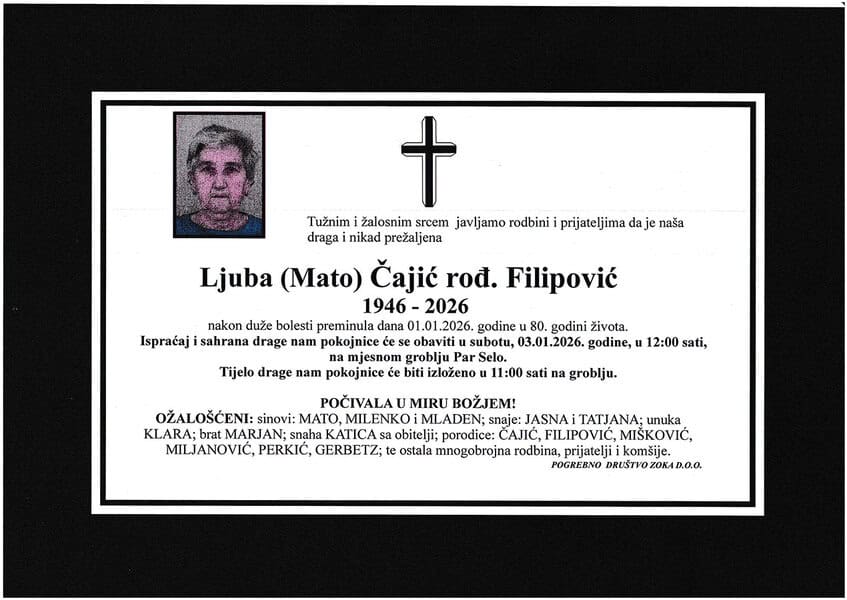 Ispraćaj i sahrana drage pokojnice obavit će se u subotu, 3. decembra 2026. godine u 12:00 sati, na mjesnom groblju Par Selo