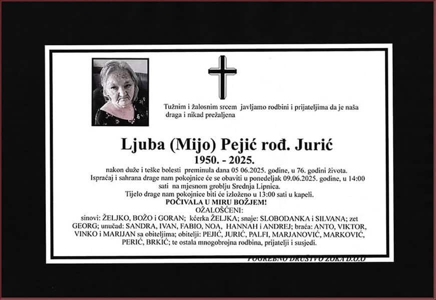 Ispraćaj i sahrana obavit će se u ponedjeljak, 9. juna 2025. godine u 14:00 sati, na mjesnom groblju u Srednjoj Lipnici. Počivala u miru Božjem!